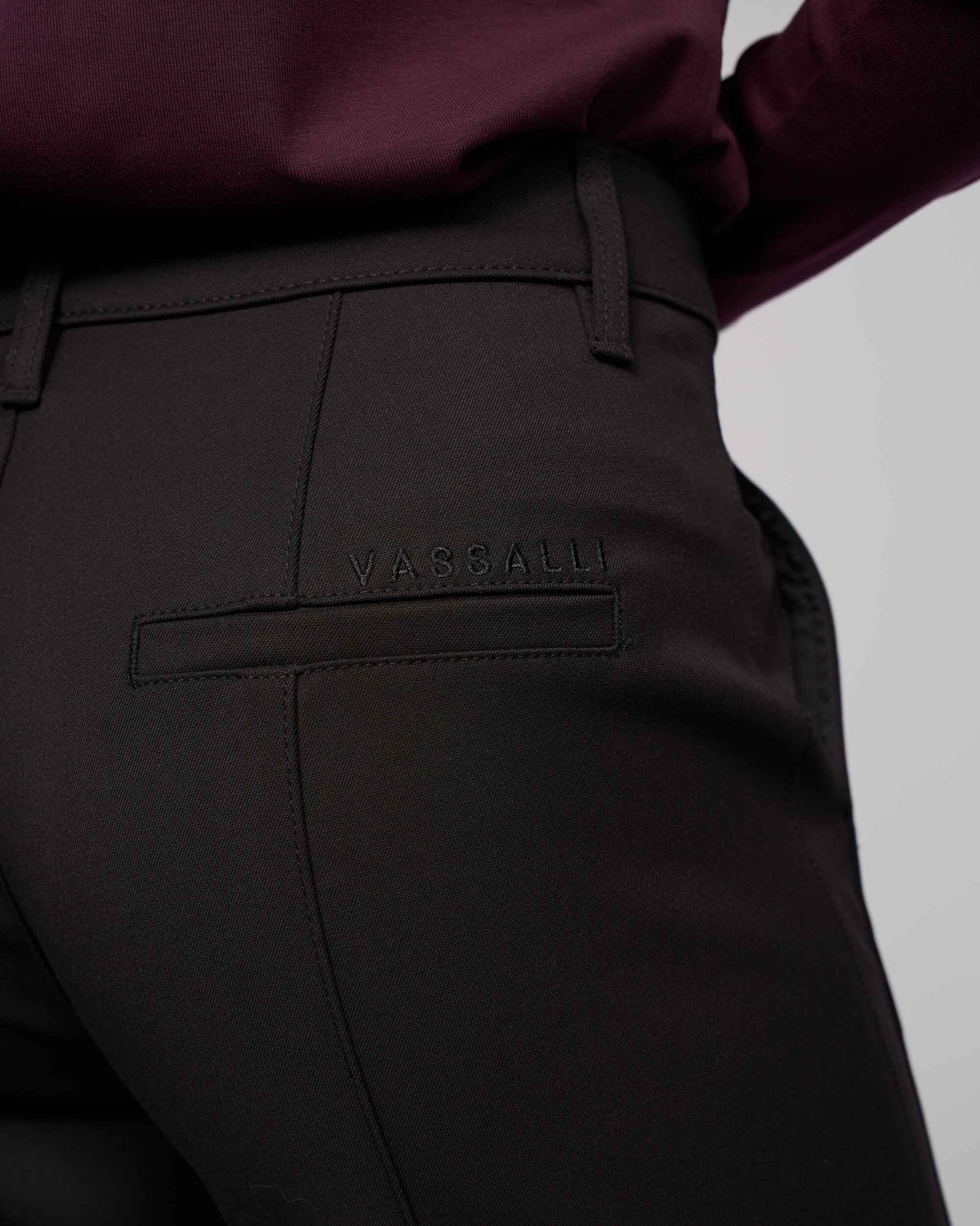 • 'Vassalli' embroidery above wearers right-hand back pocket