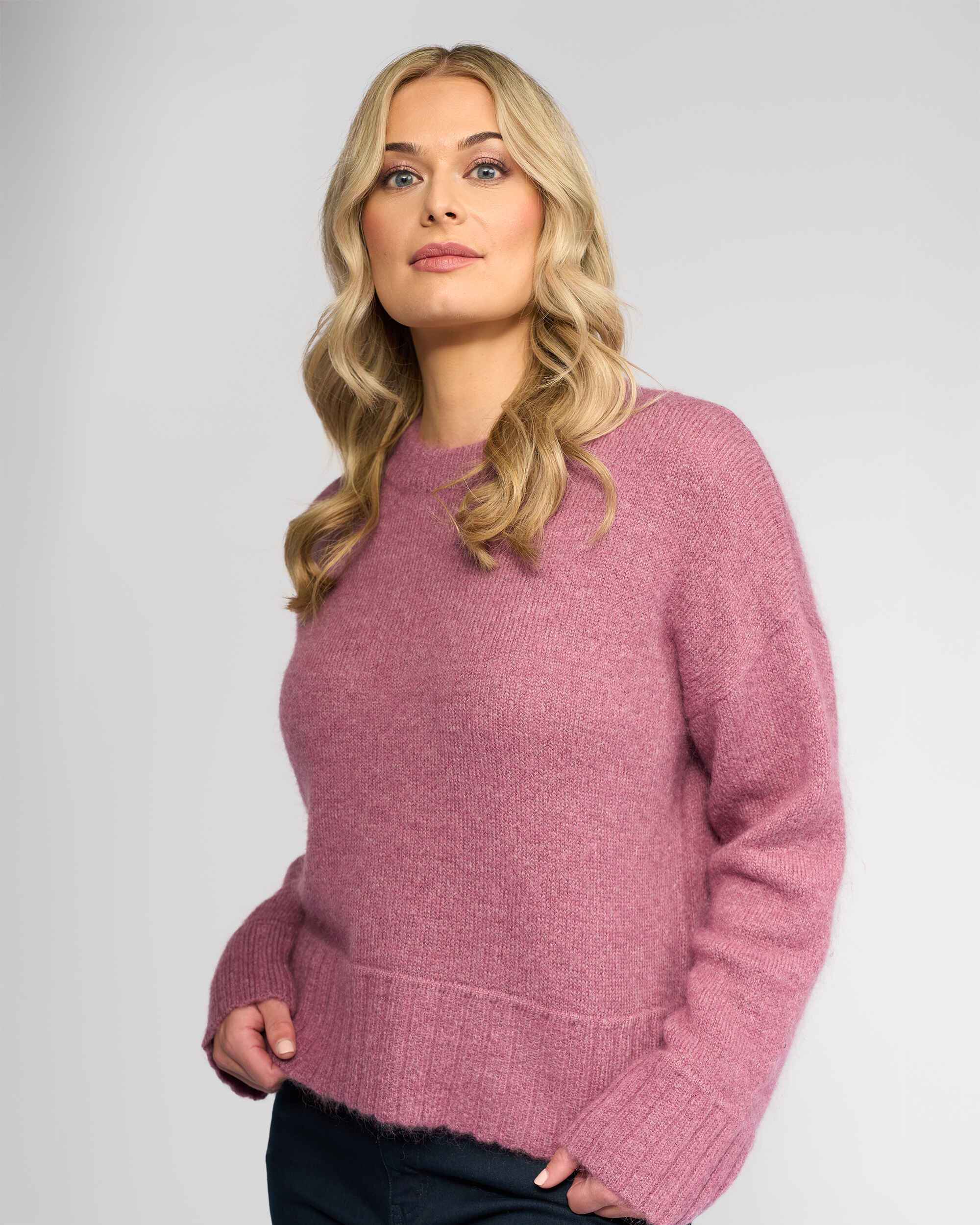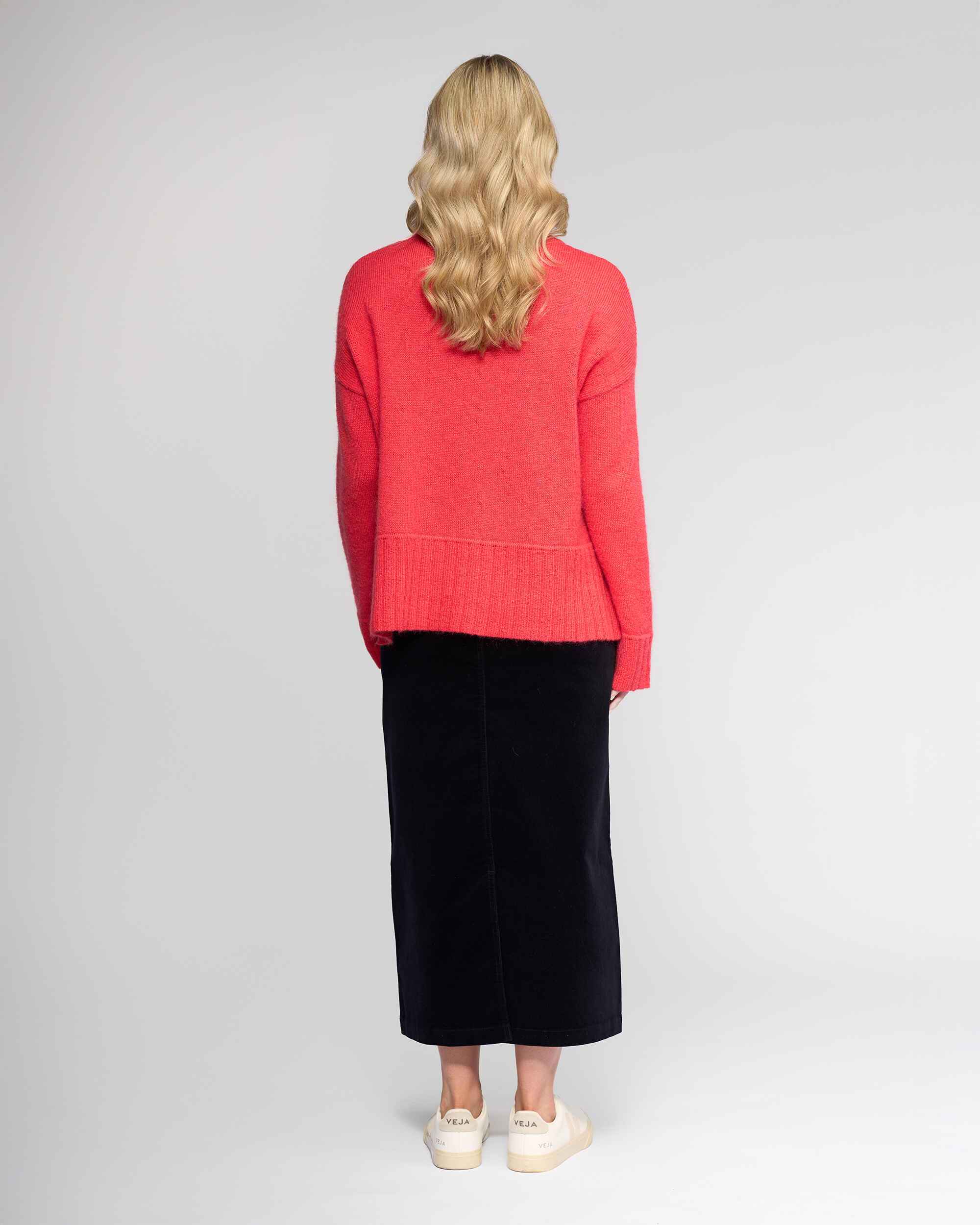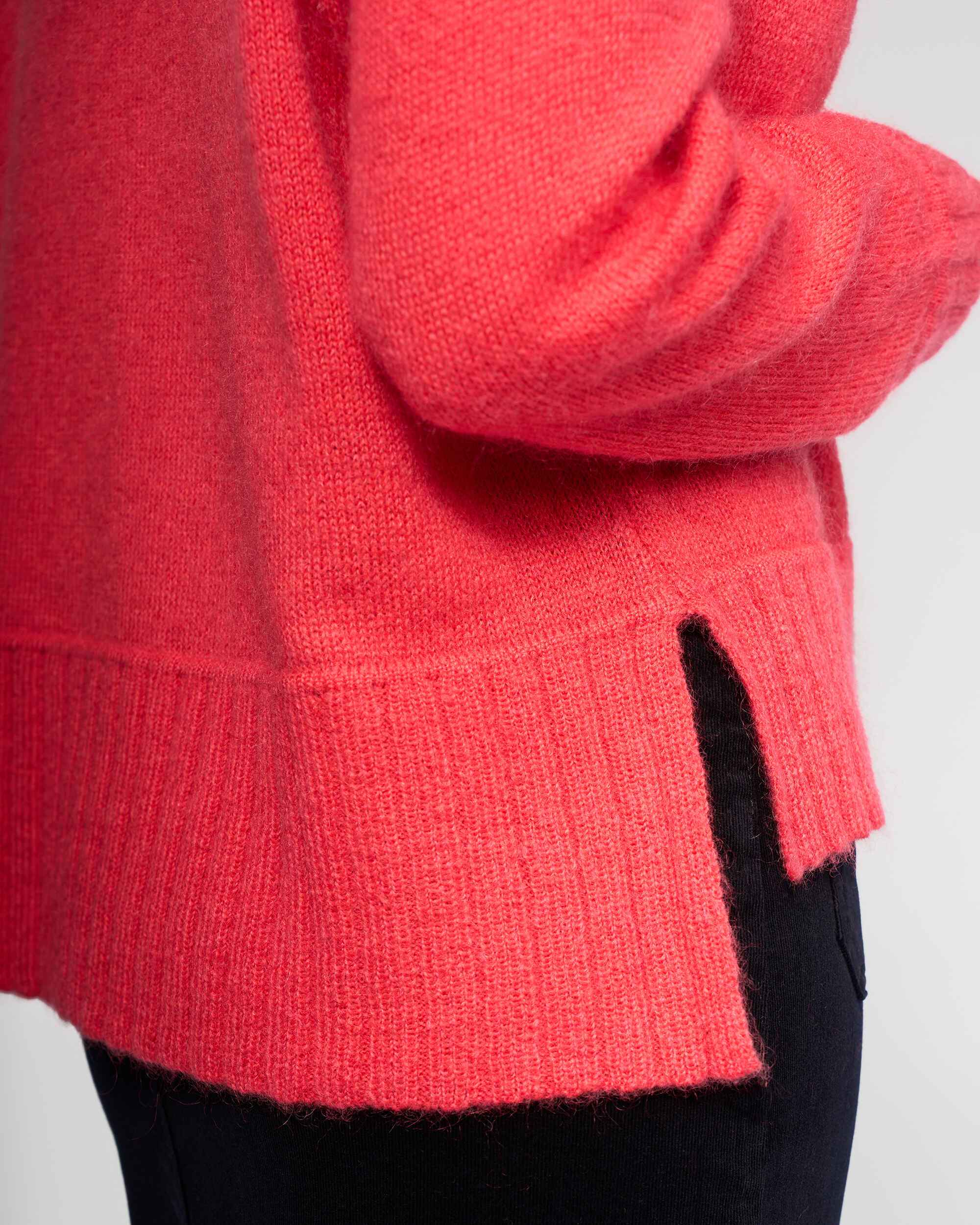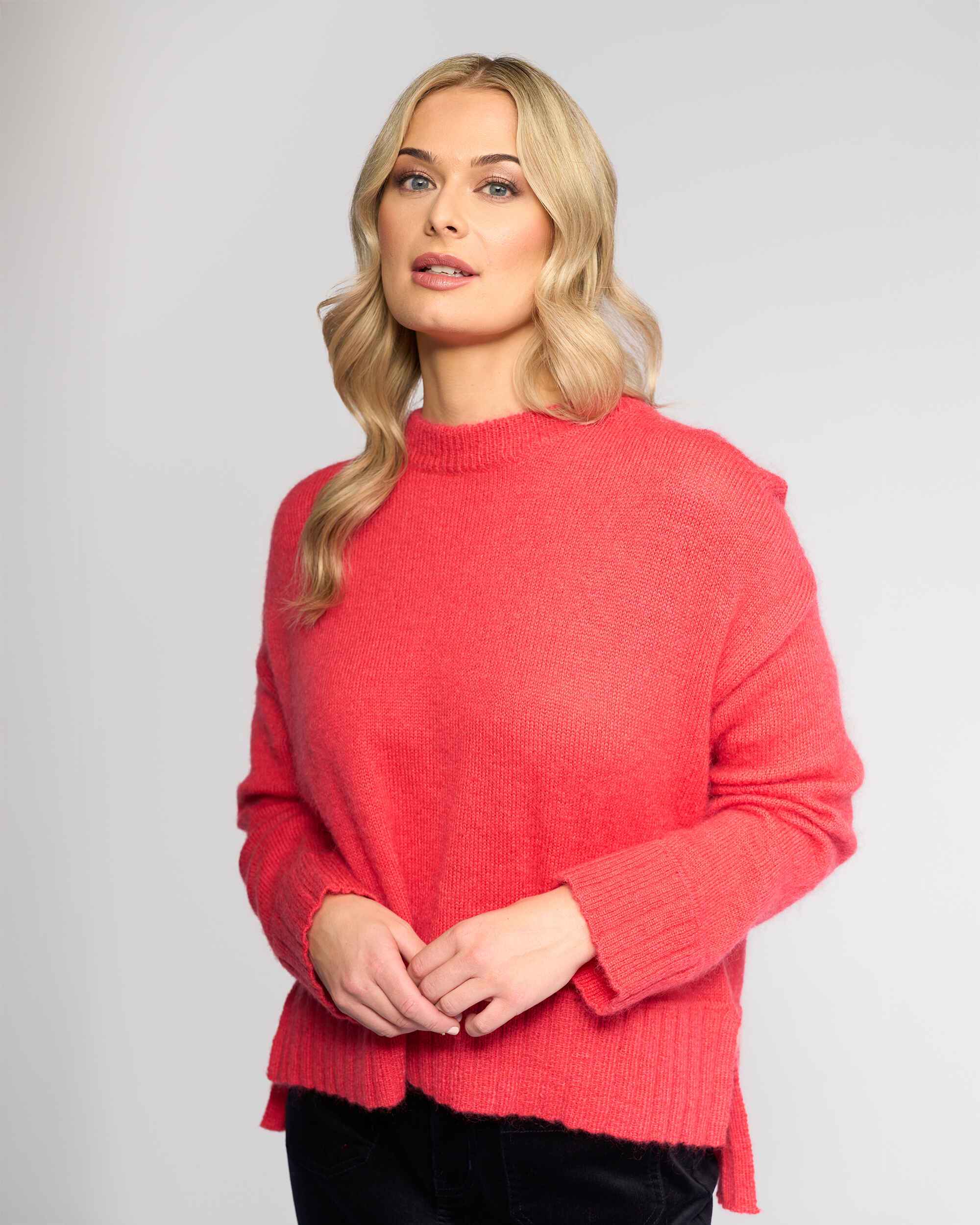 A soft, cosy sweater in our Coral shade — warm, bright, and perfect for layering. Designed with a relaxed fit and drop-shoulder sleeves, this style features a high-low hem with side splits, and ribbed detailing at the neckline, cuffs, and hem. Knitted with a blend that includes wool and mohair for warmth.