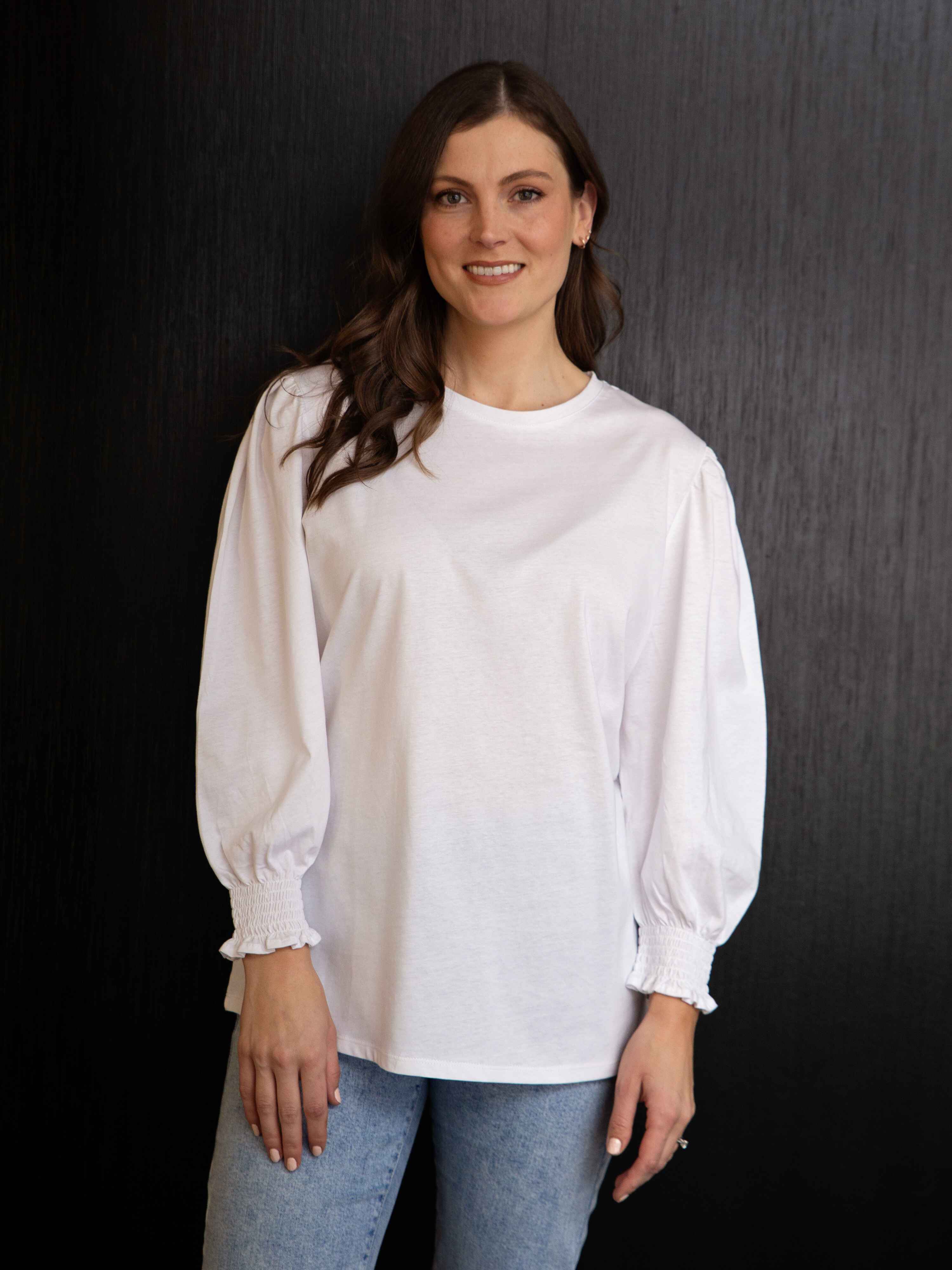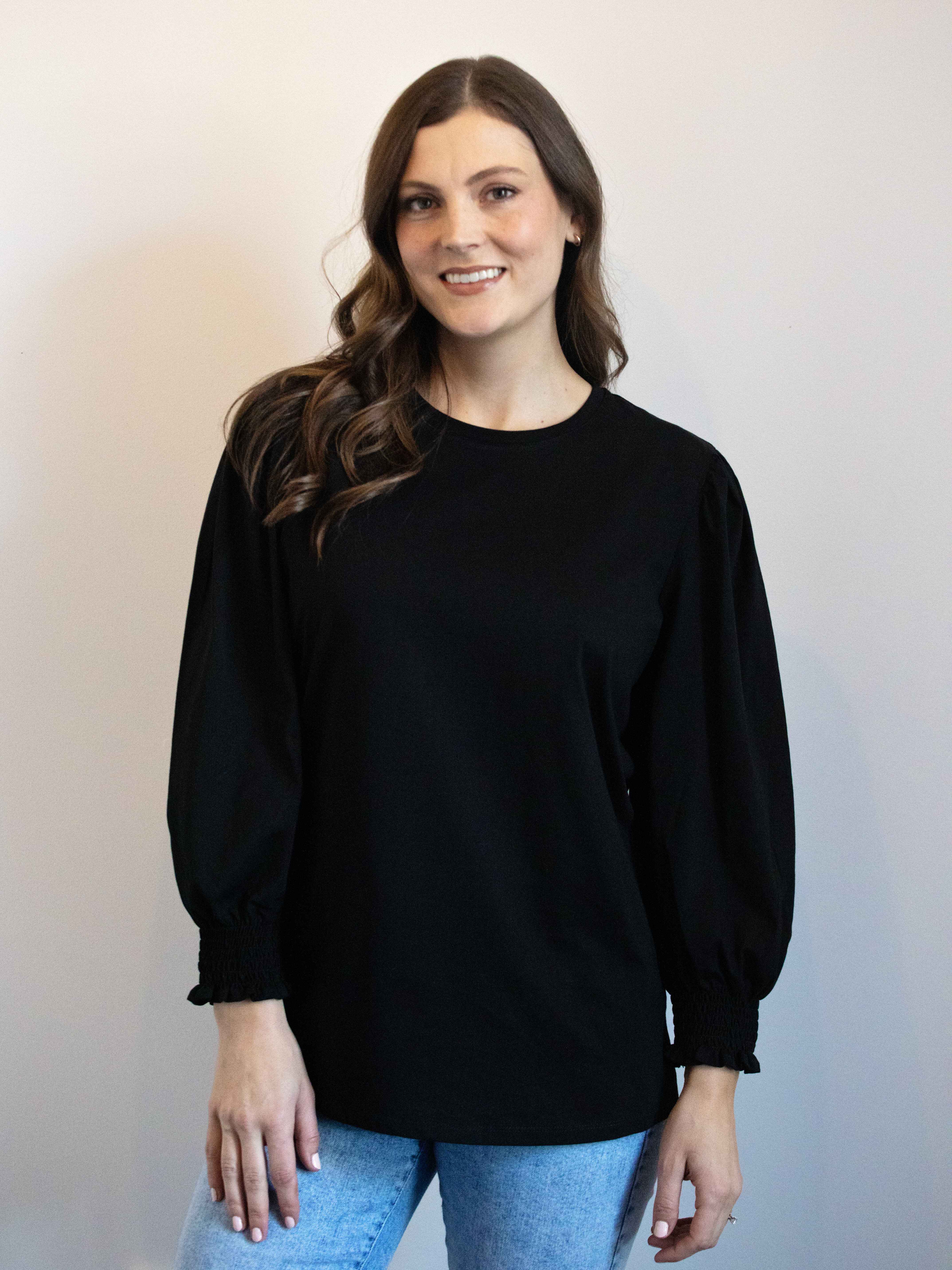 A soft, easy-wear top crafted from breathable fabric for everyday comfort. Featuring a classic crew neckline and statement puff sleeves with shirred cuffs, it adds a feminine touch to a relaxed silhouette—available in white and black.