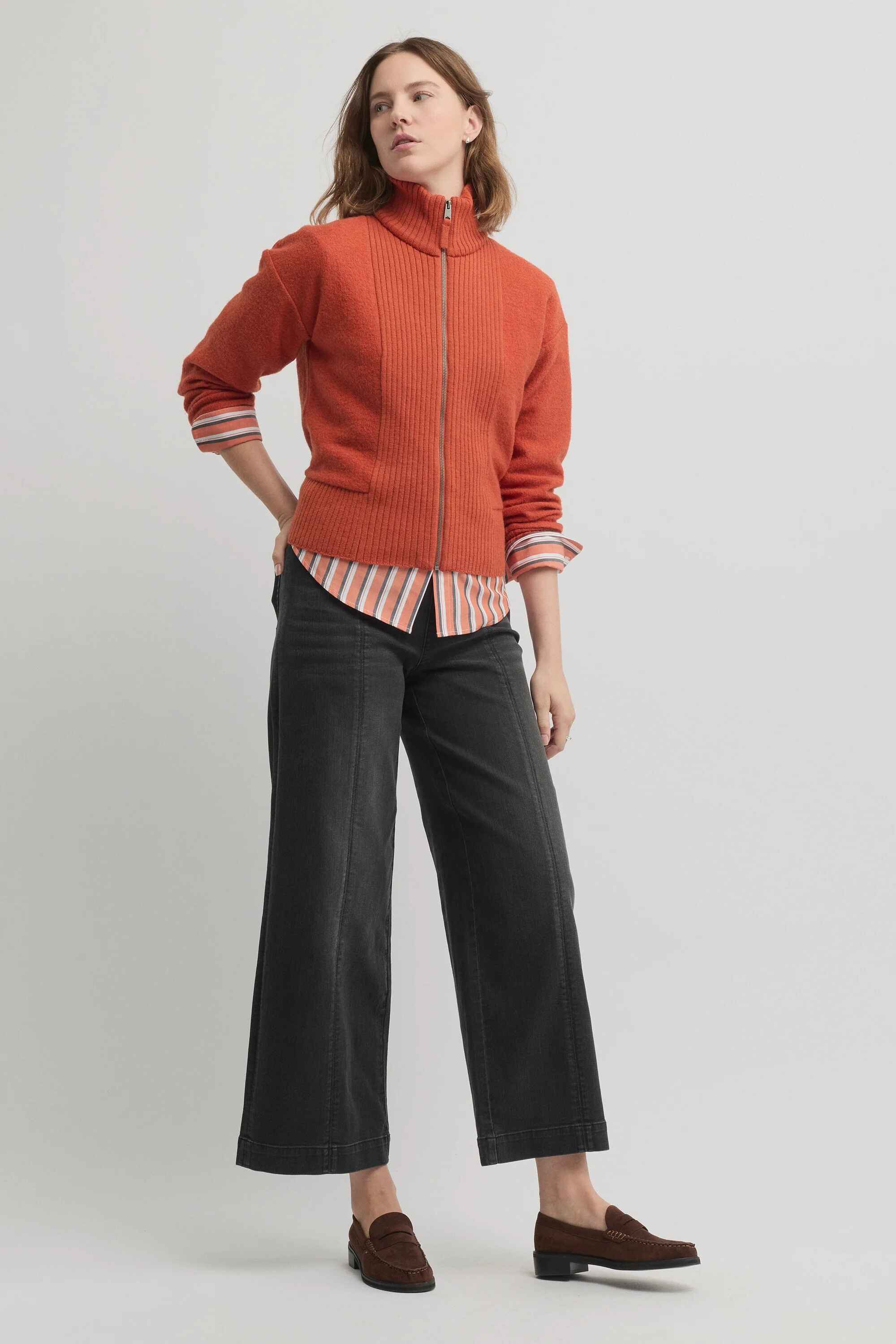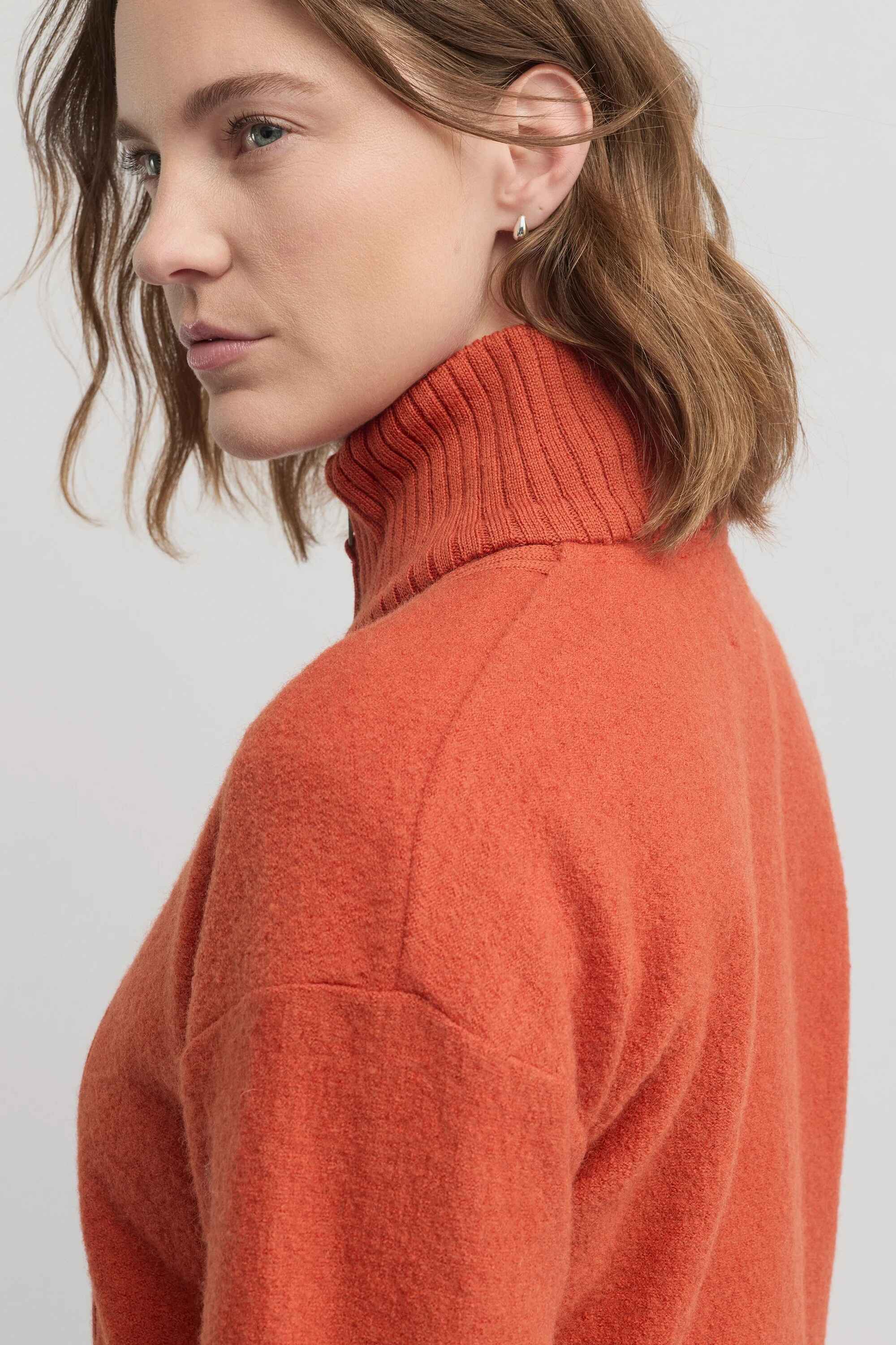 Made from 100% boiled Wool, this knit ensures style, comfort and warmth throughout the season. Crafted in relaxed fit, finishing below wait line the Ember Jacket brings refined silhouette of contemporary touch to this season. Front zip through and long sleeves ensure the comfort while turtleneck add timeless touch. This knit can be worn on its own or seamlessly layer over a shirt or a tank for more styling options.100% WoolCare Instructions:Wash inside out, cold gentle wash with similar colours. Do not soak or bleach. Line dry in shade, do not tumble dry. Dry cleanable. Always check the label.