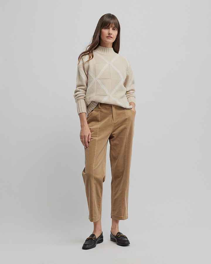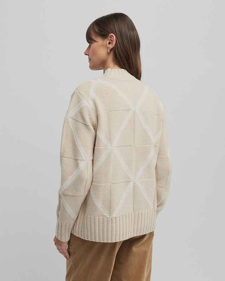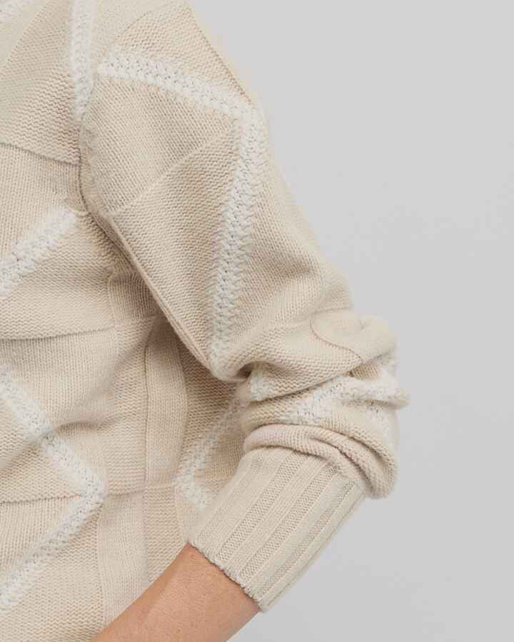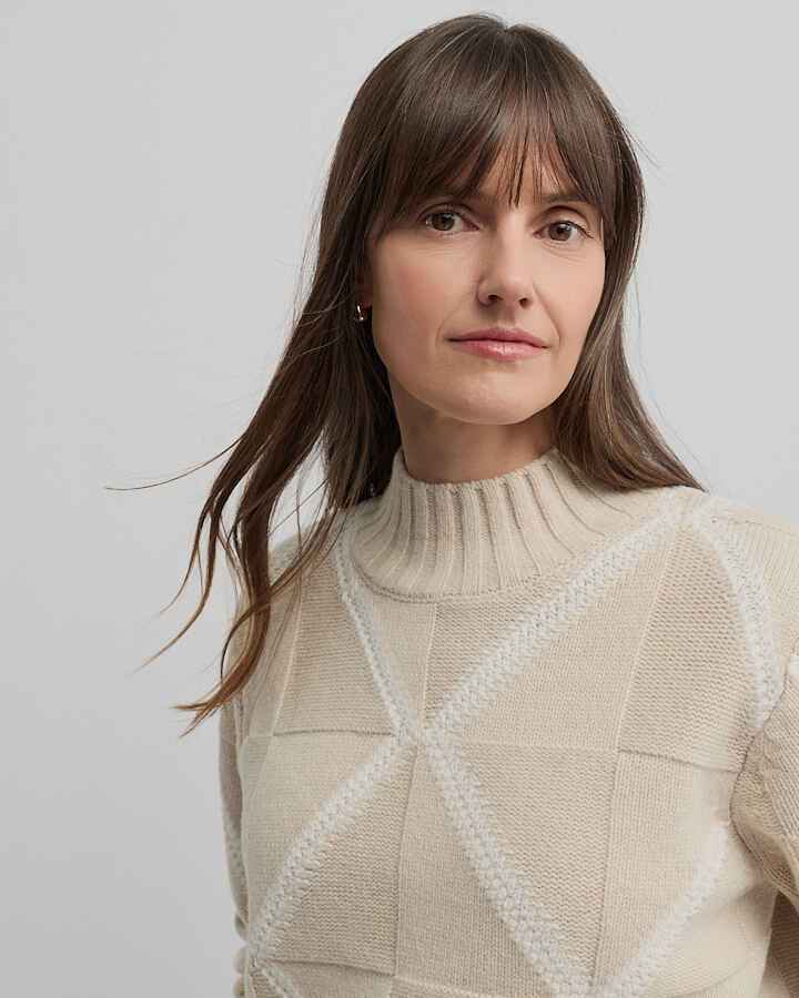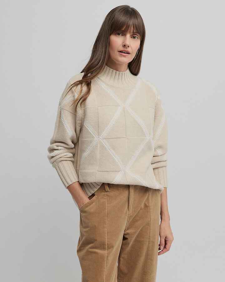 A cozy and contemporary knit sweater in a soft neutral tone, designed with a subtle geometric pattern that adds texture and visual interest. Featuring a classic high neckline and relaxed fit, it offers both warmth and effortless style. The long sleeves and ribbed cuffs enhance its snug, comfortable feel, making it perfect for cooler days. Easy to pair with everything from tailored trousers to casual denim, this versatile piece is a timeless addition to any wardrobe.