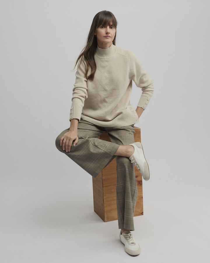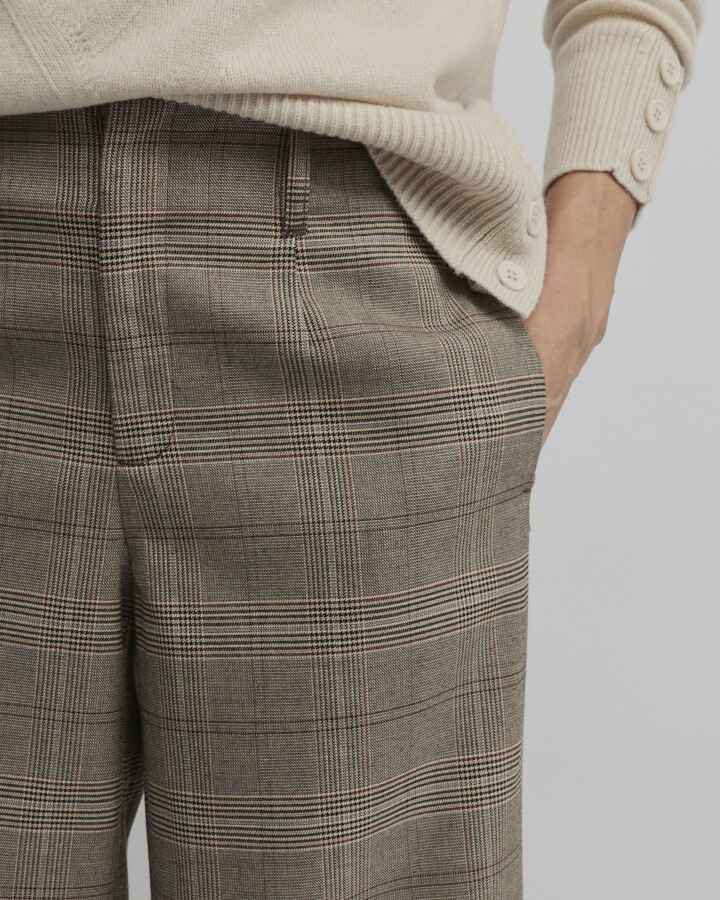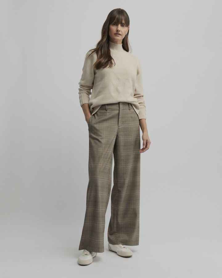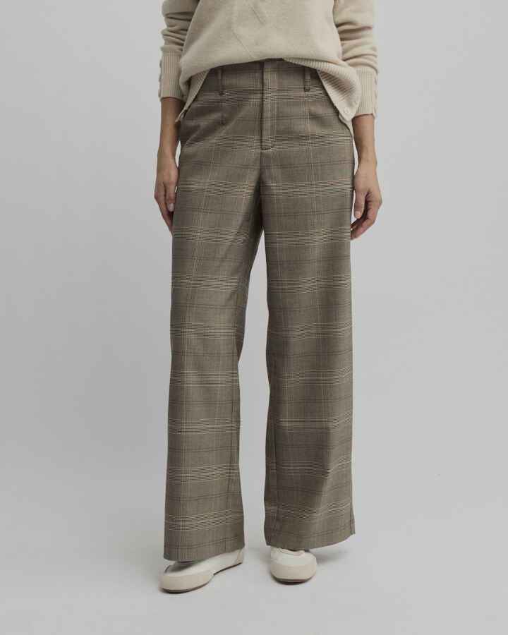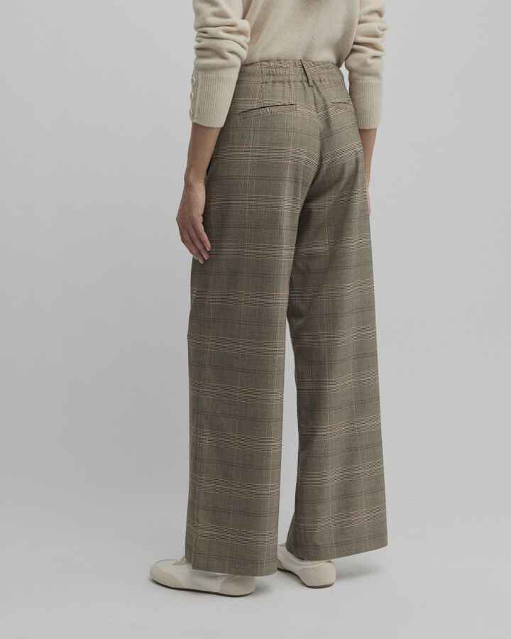 A tailored wide-leg pant featuring a classic check pattern in warm, earthy tones, offering a sophisticated yet modern look. Designed with a flattering high-rise waist and clean front detailing, it creates a sleek silhouette that elongates the legs. The structured fabric holds its shape beautifully, while the relaxed wide-leg cut ensures all-day comfort. Perfect for both work and weekend wear, these versatile trousers pair effortlessly with knitwear or crisp shirts for a polished finish.60% Polyester24% Viscose8% Wool2% Elastane