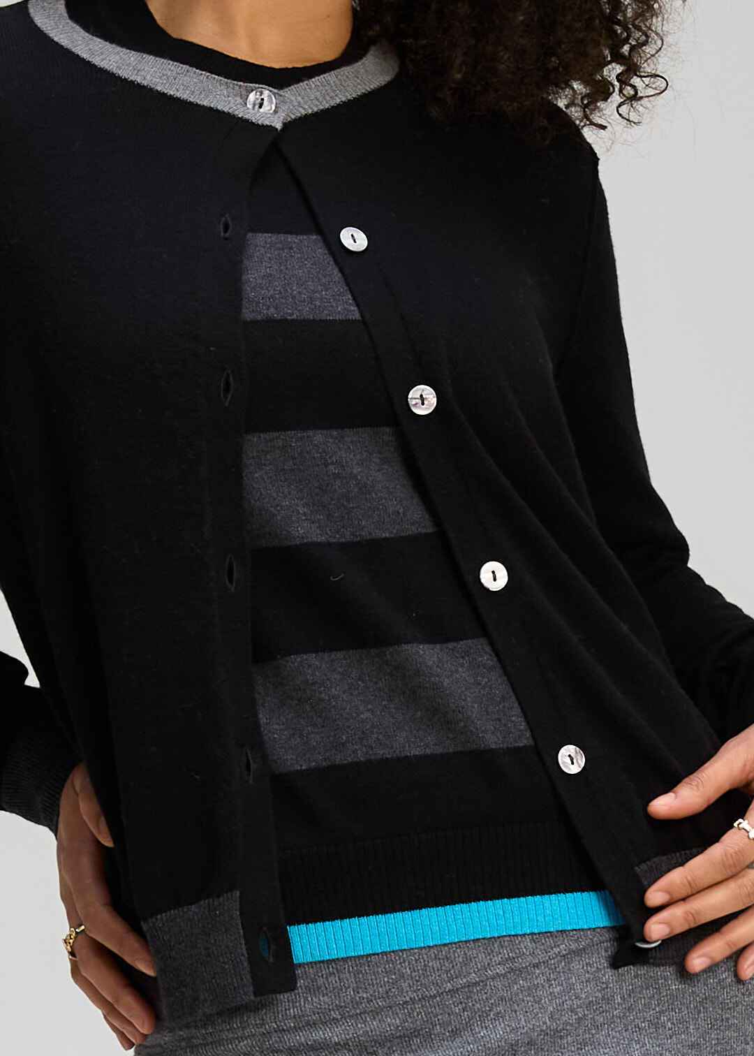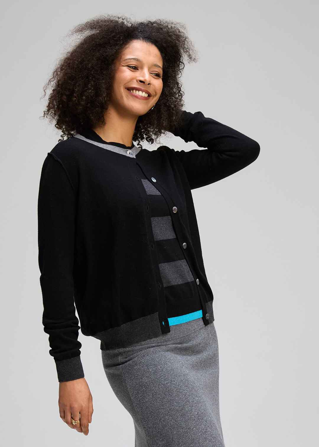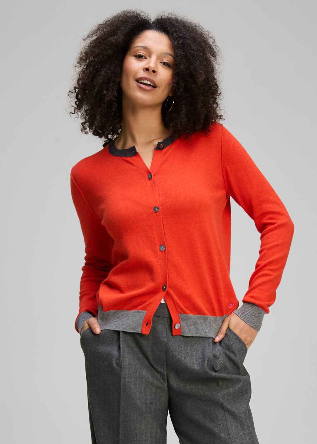 A timeless layering piece with a modern twist. This soft knit cardigan features a classic crew neckline, full button-front closure, and subtle contrast trims at the collar, cuffs, and hem for added detail. Designed with a flattering, easy fit, it’s perfect for wearing on its own or layered over shirts and tees. Available in bold paprika, classic black, and vibrant rhubarb for versatile everyday styling.