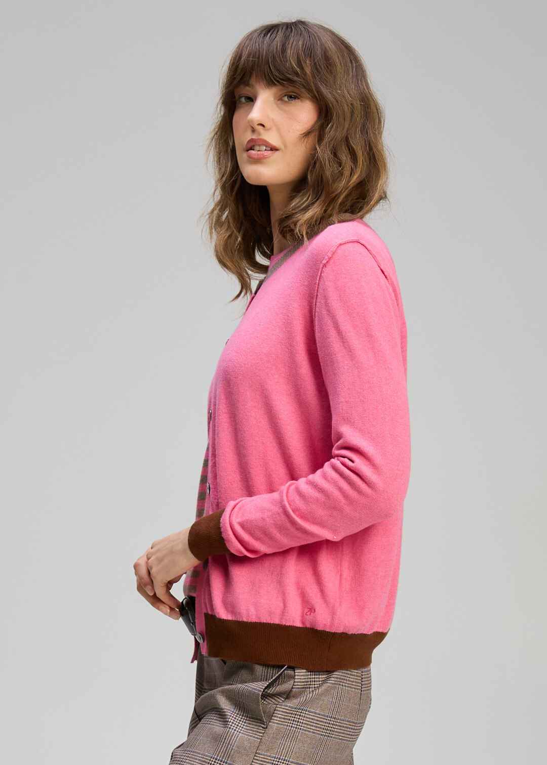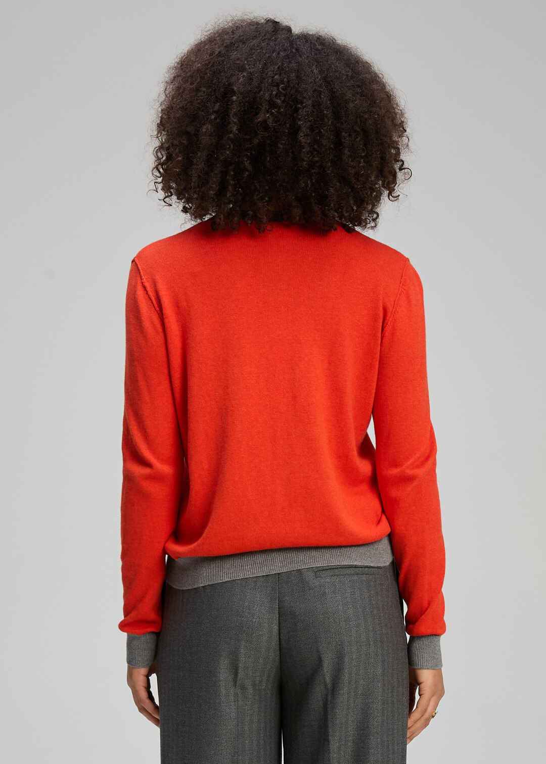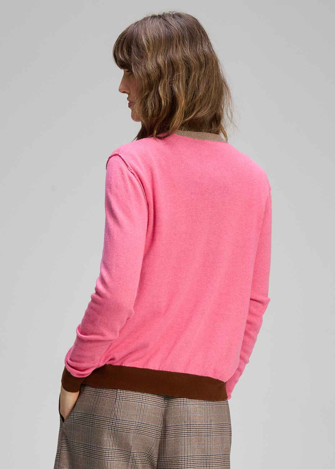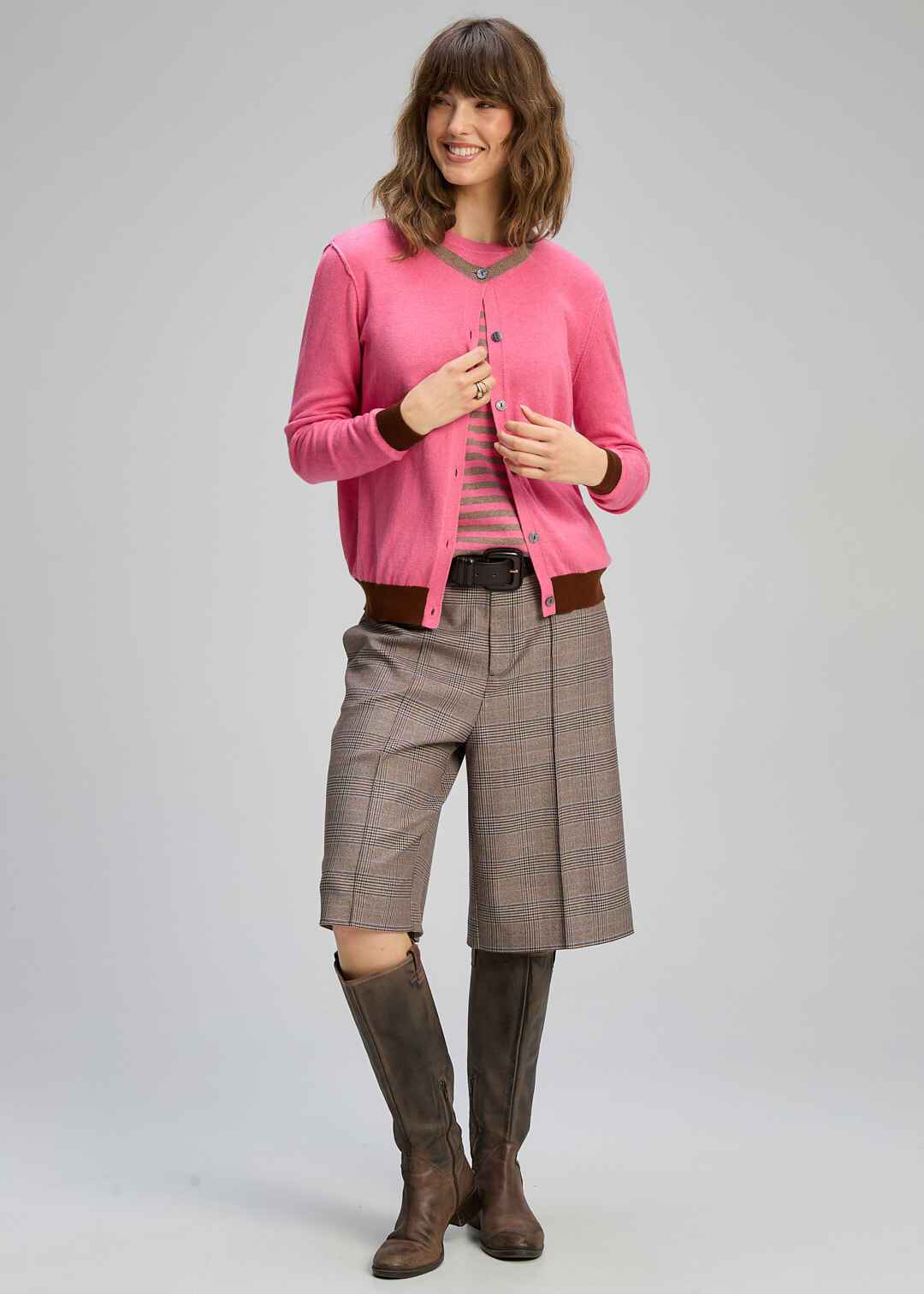 A timeless layering piece with a modern twist. This soft knit cardigan features a classic crew neckline, full button-front closure, and subtle contrast trims at the collar, cuffs, and hem for added detail. Designed with a flattering, easy fit, it’s perfect for wearing on its own or layered over shirts and tees. Available in bold paprika, classic black, and vibrant rhubarb for versatile everyday styling.