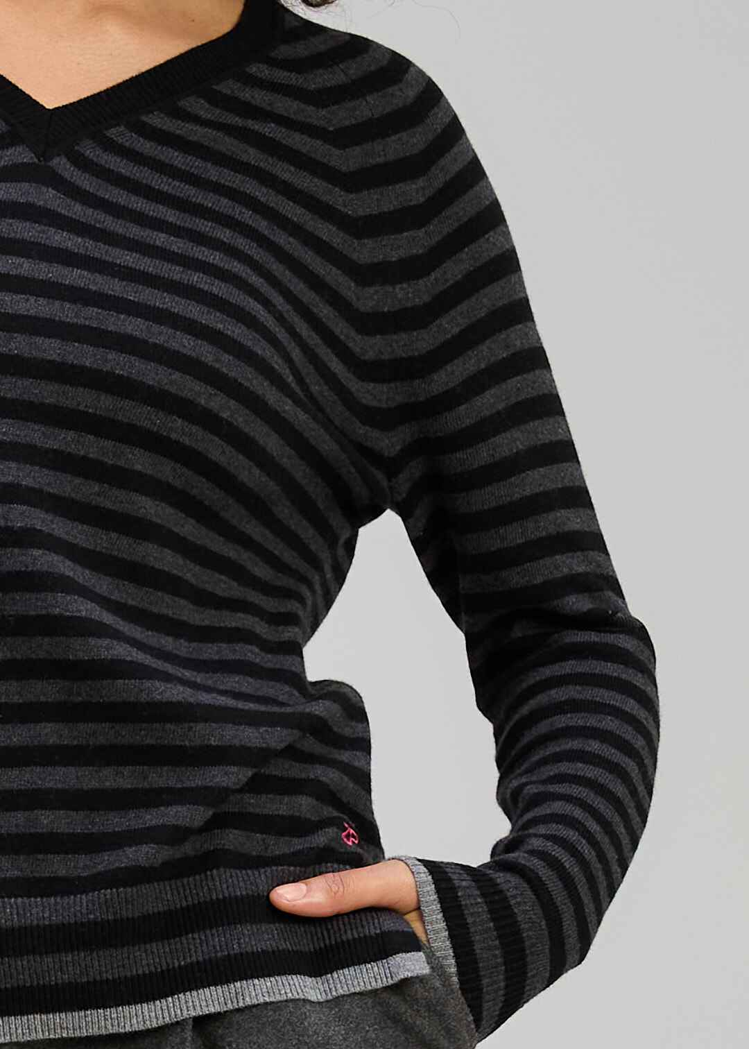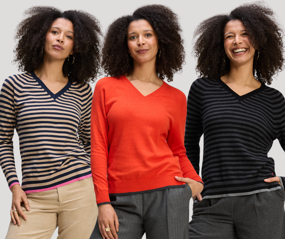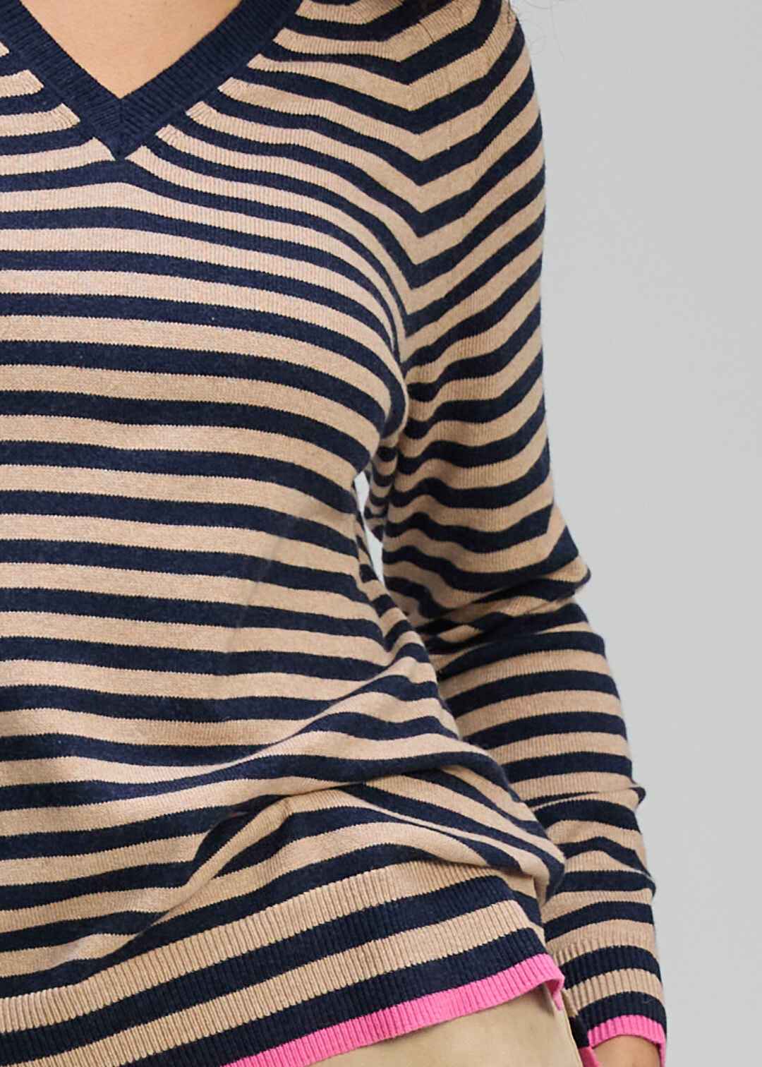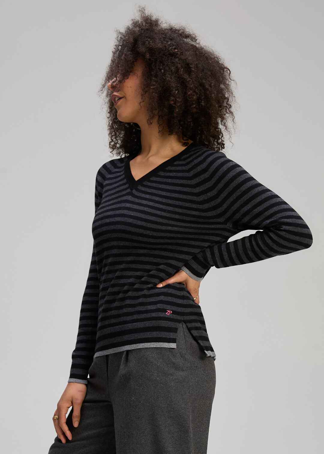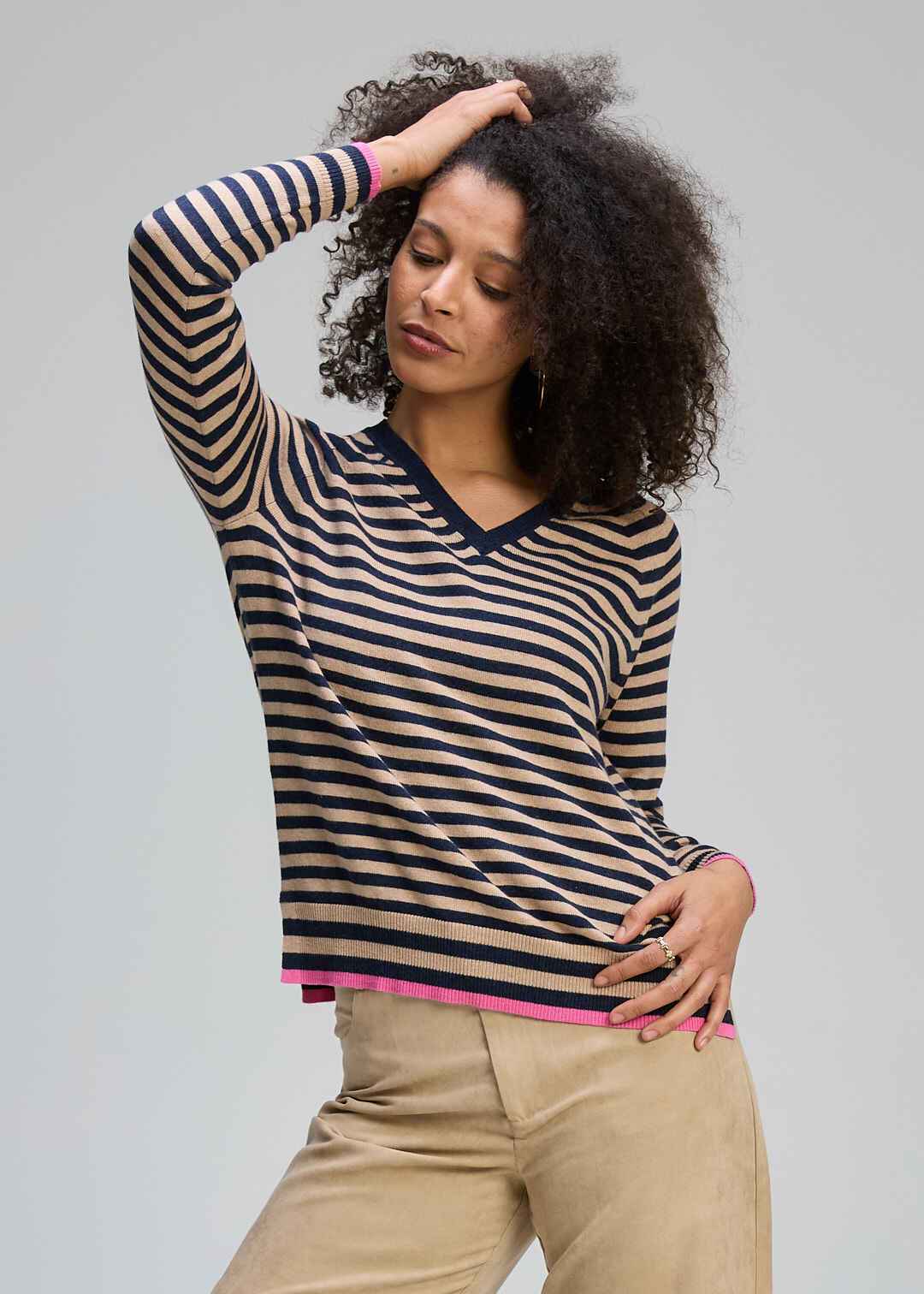 A timeless essential designed for effortless everyday wear. This soft V-neck knit features a flattering, streamlined fit with ribbed trims for a polished finish. Available in bold solid and classic stripe options, it’s perfect for layering or wearing on its own. An easy wardrobe staple that pairs seamlessly with tailored trousers or casual denim.