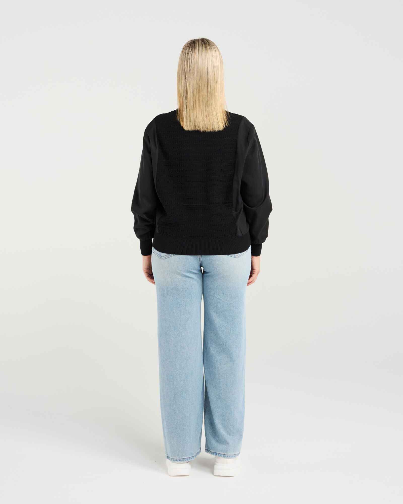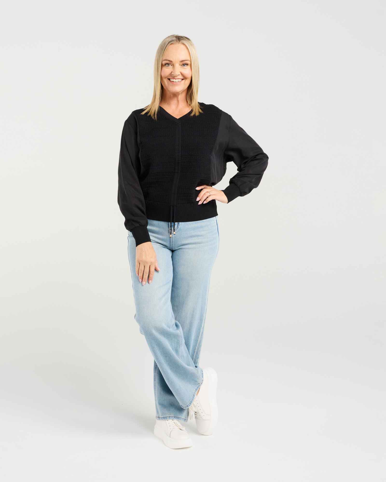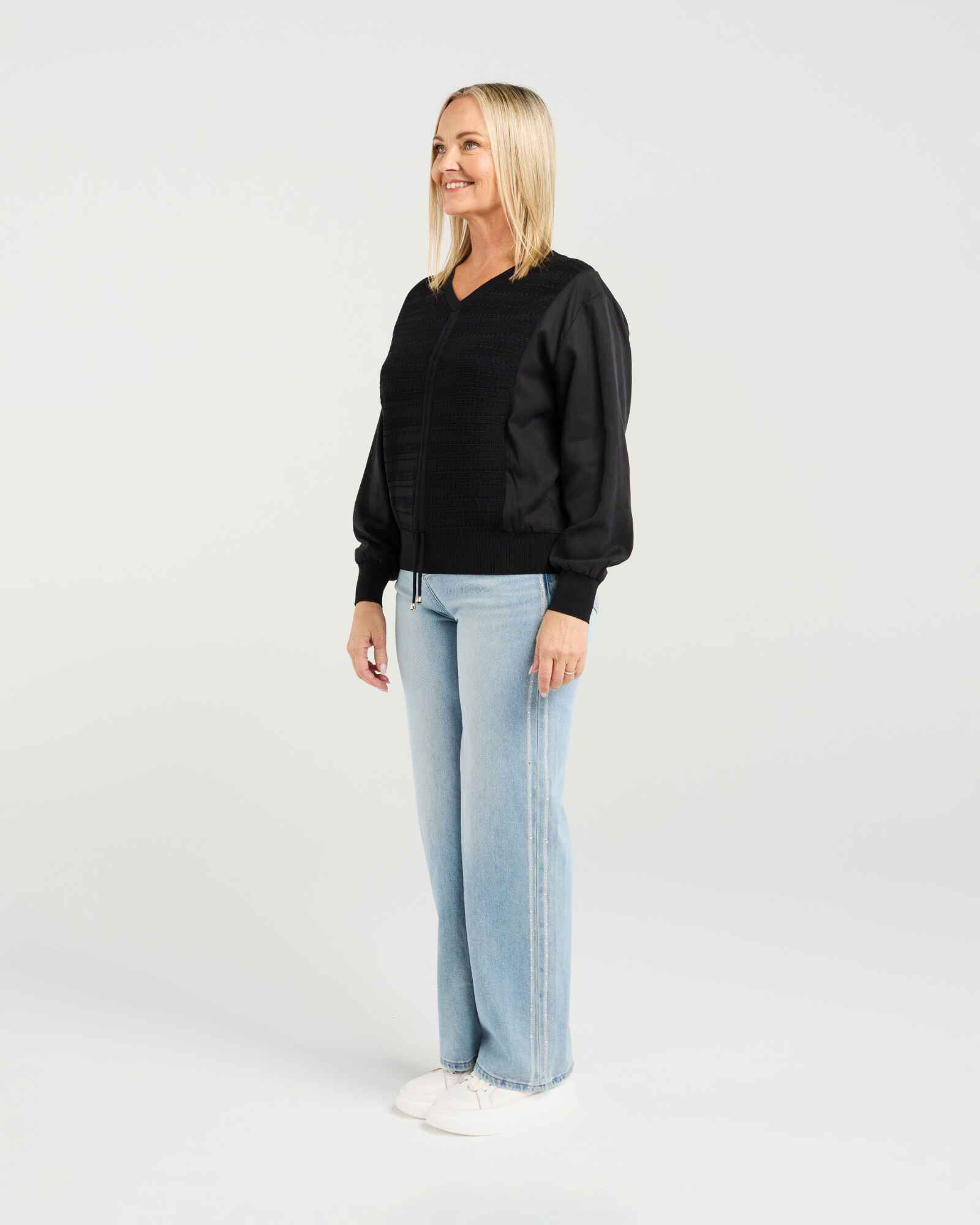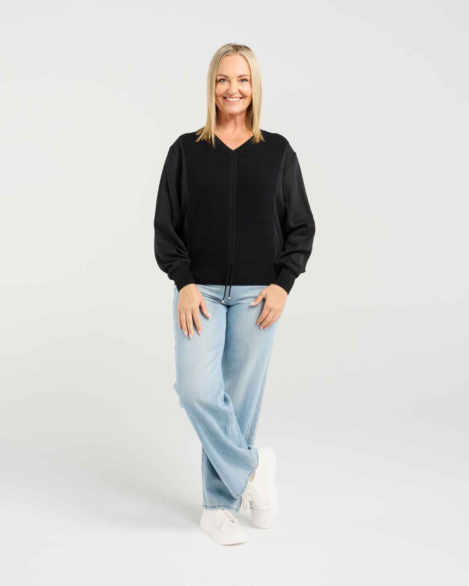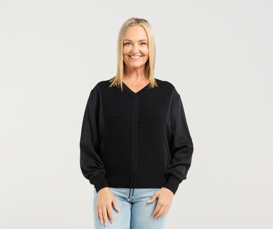 This long-sleeve top features a flattering V-neckline and rich black textures that add depth while keeping the look timeless. A subtle drawstring detail at the front brings shape and interest without taking away from its classic appeal. An effortlessly chic black top with a modern twist for the season.