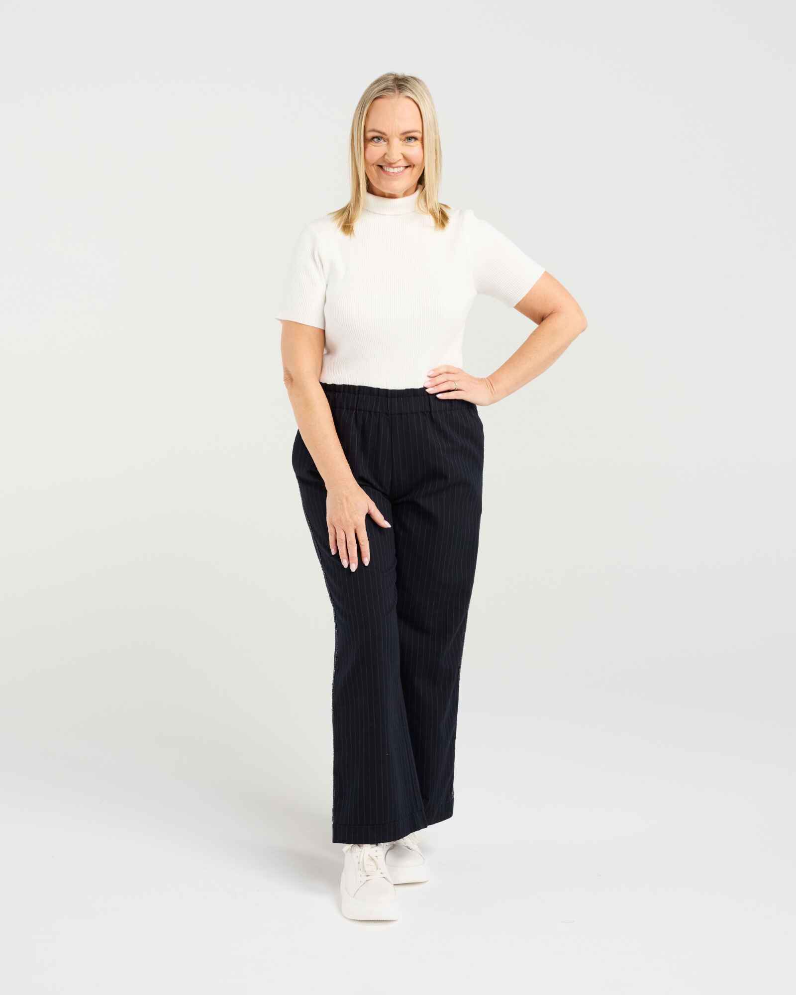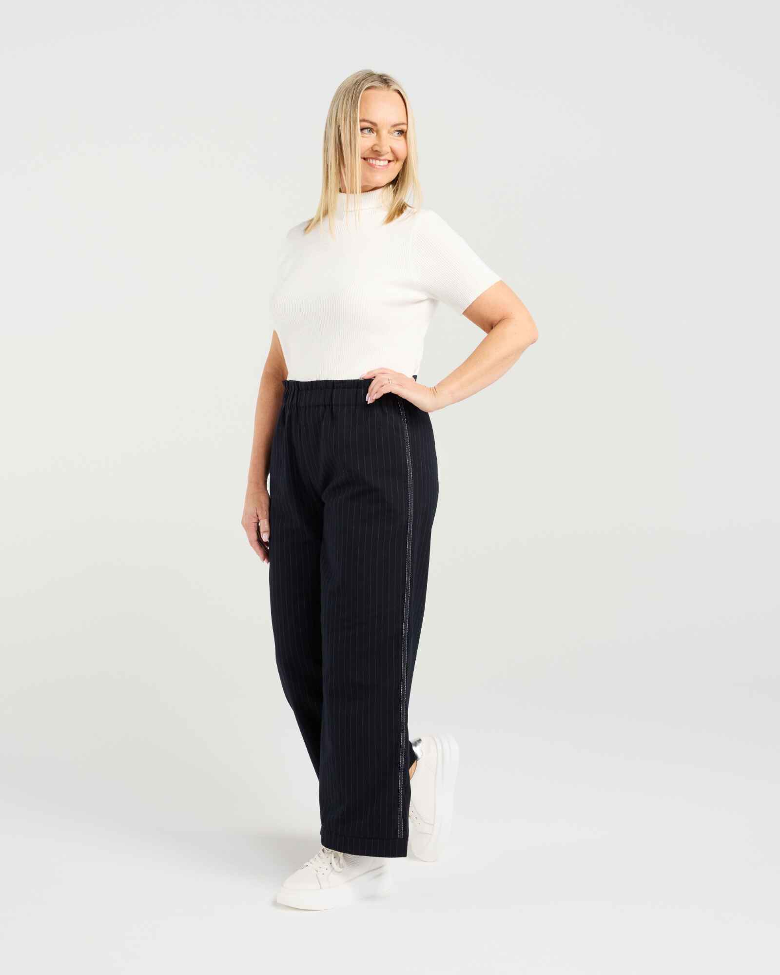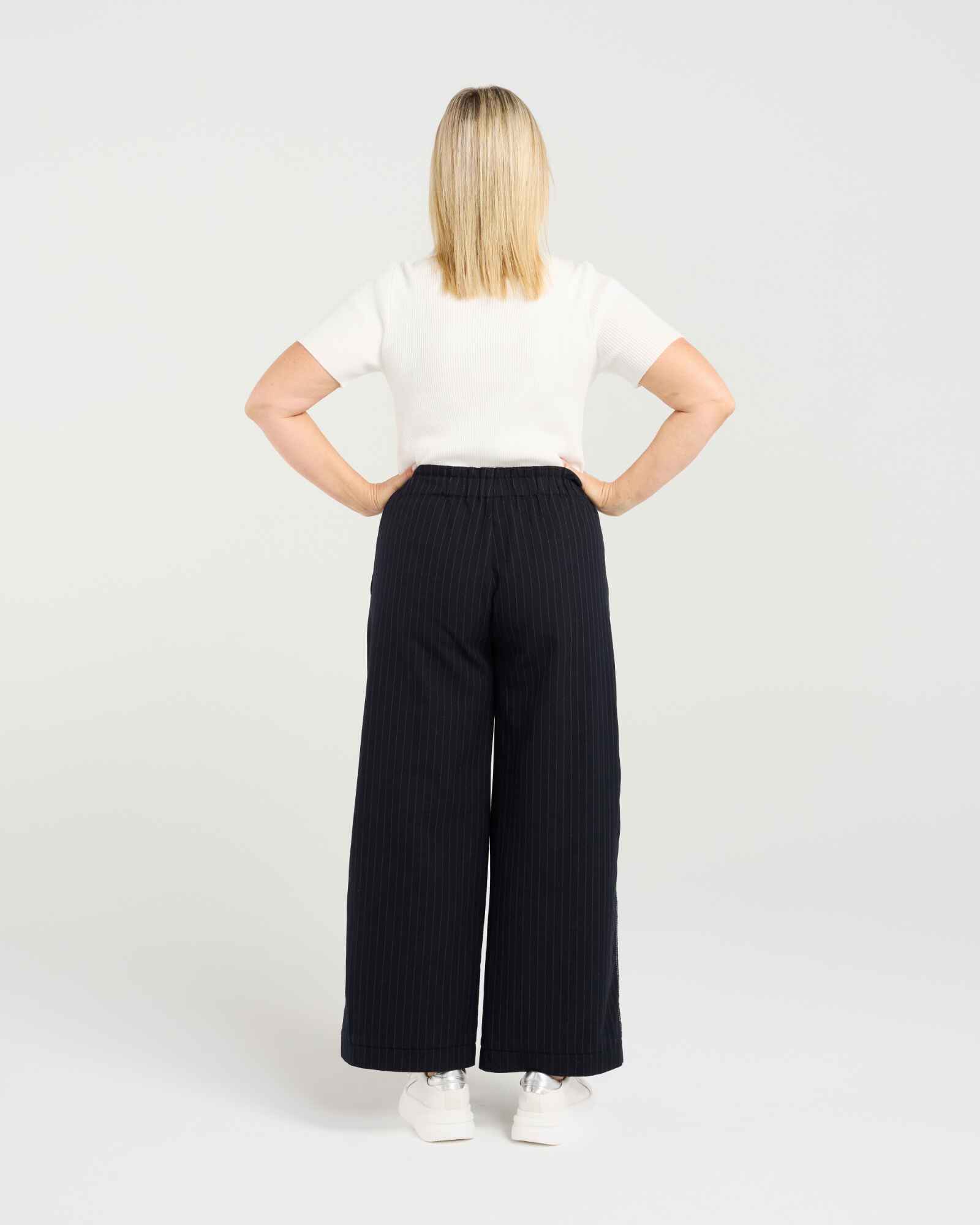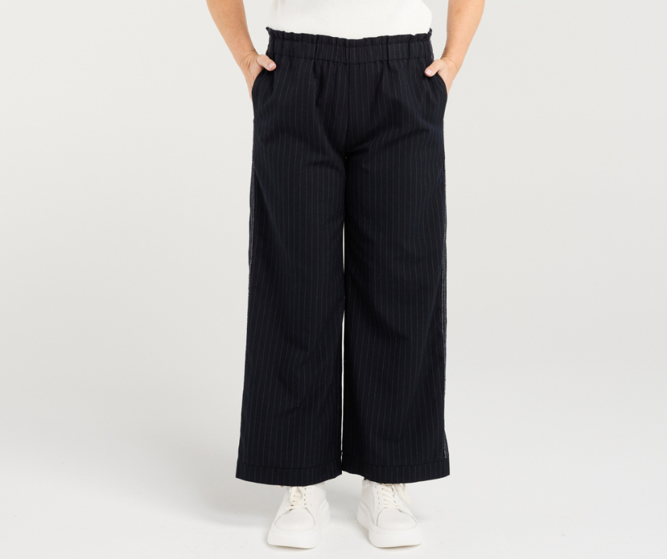 These wide-leg pinstripe pants combine effortless elegance with all-day comfort, featuring a relaxed silhouette and an elasticated waistband. Sleek and versatile, they’re perfect for polished winter styling without compromising ease of wear.