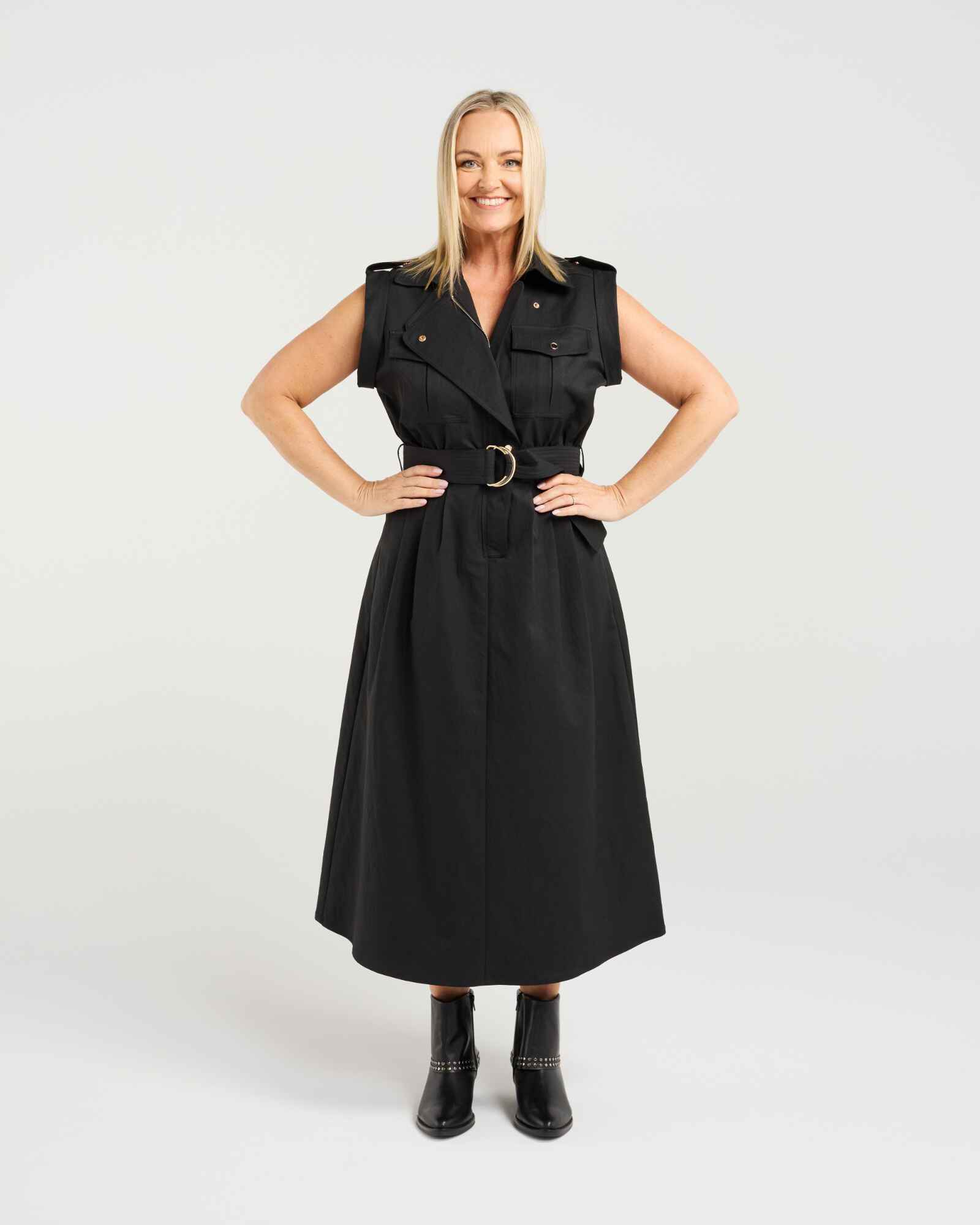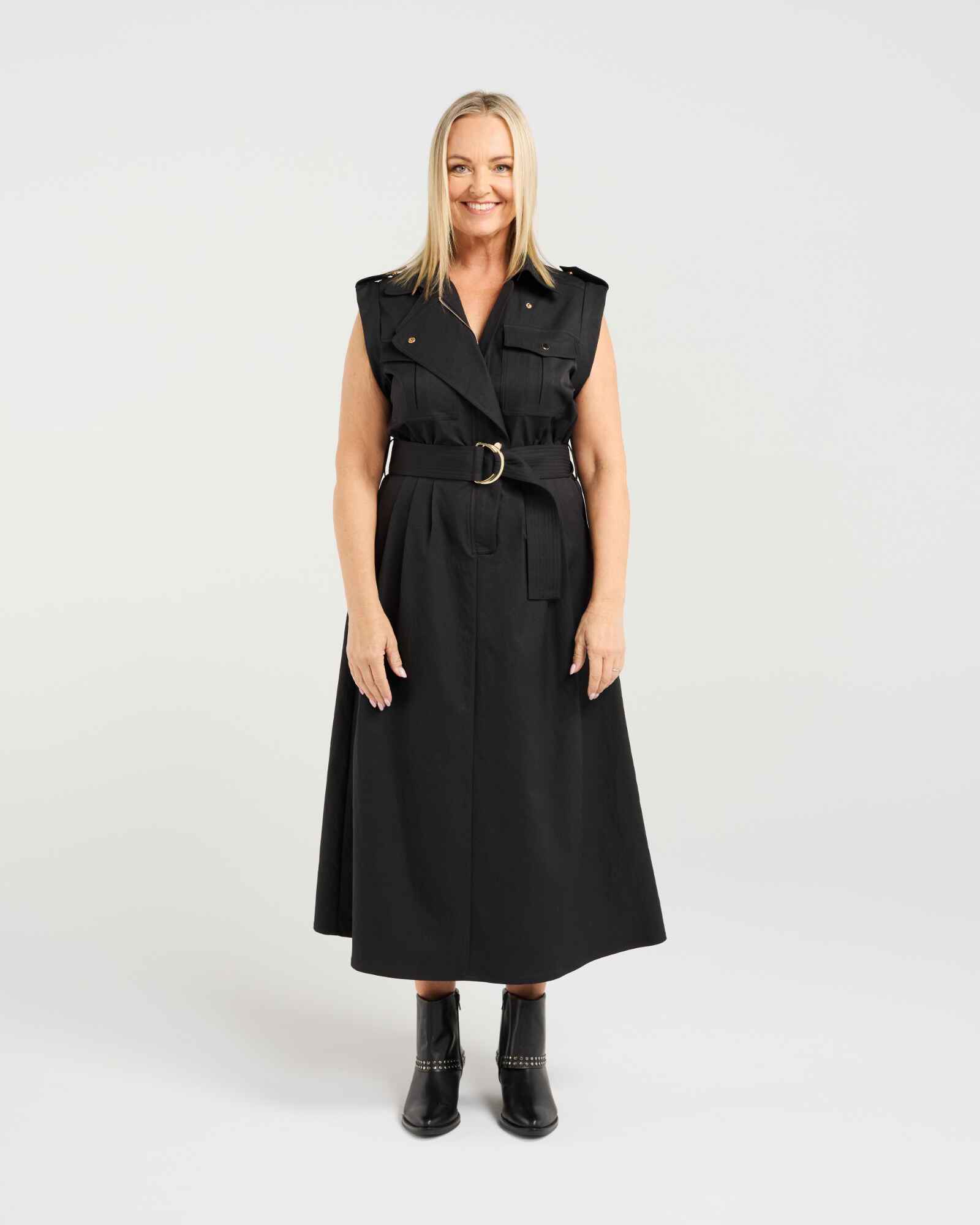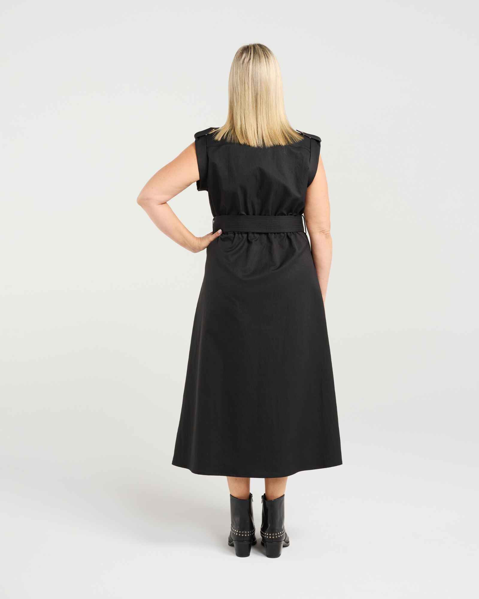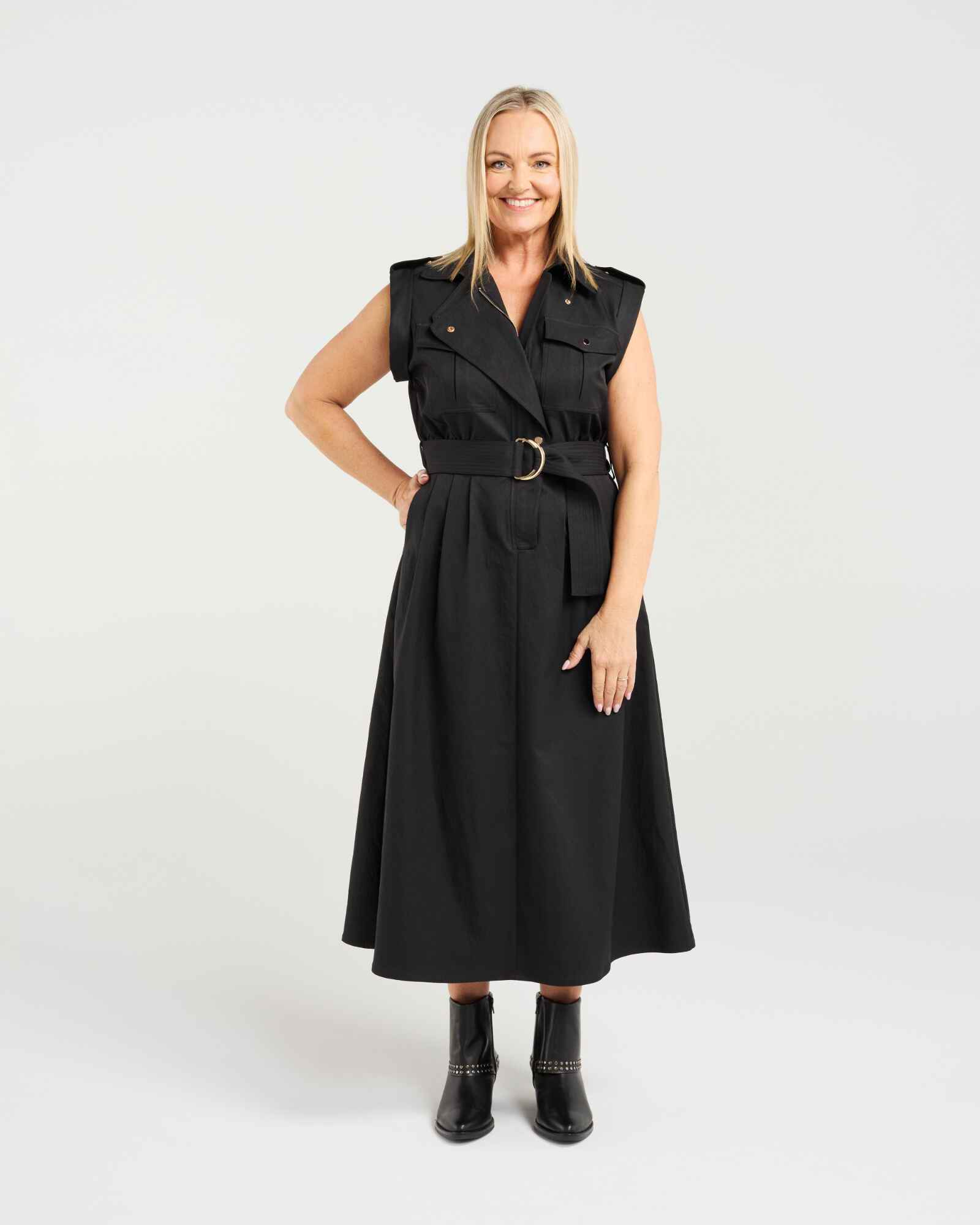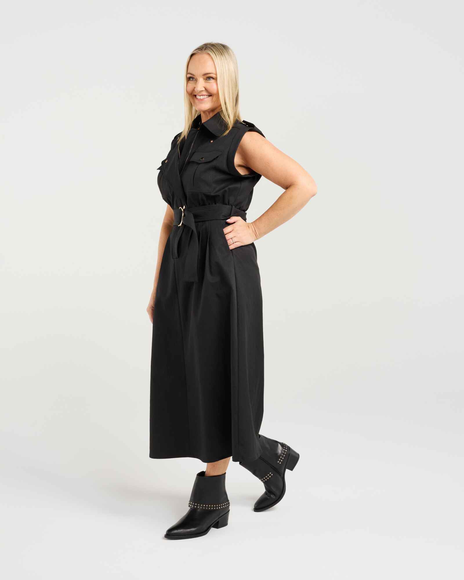 This sleeveless black dress brings a modern edge with its collared bodice and subtle utility-inspired details. A matching belt shapes the waist for a sharp, flattering silhouette, and its versatile design lets you wear it on its own or layered over a top for added warmth. Cool, confident, and effortlessly stylish, it’s a standout piece for any winter wardrobe.